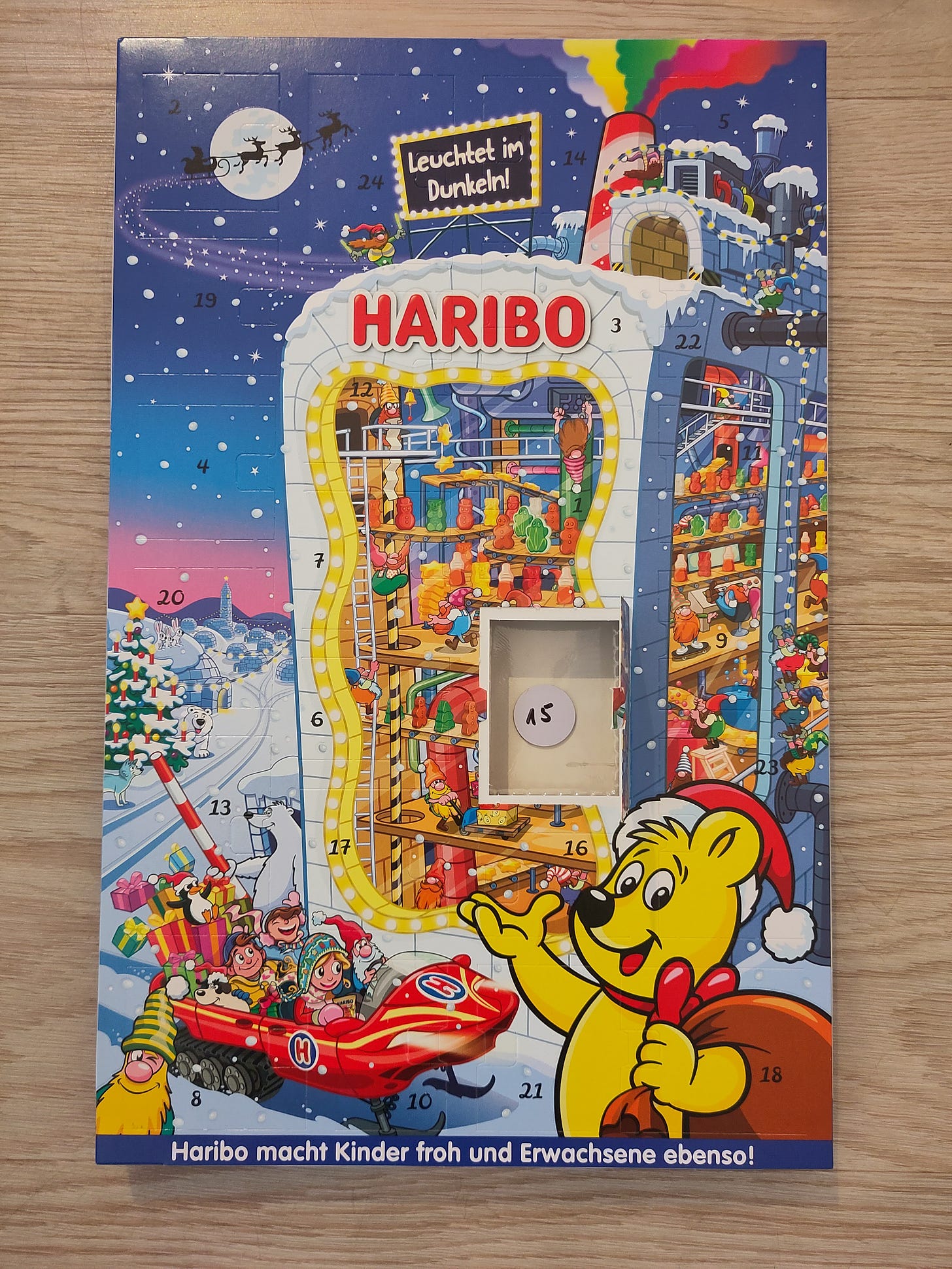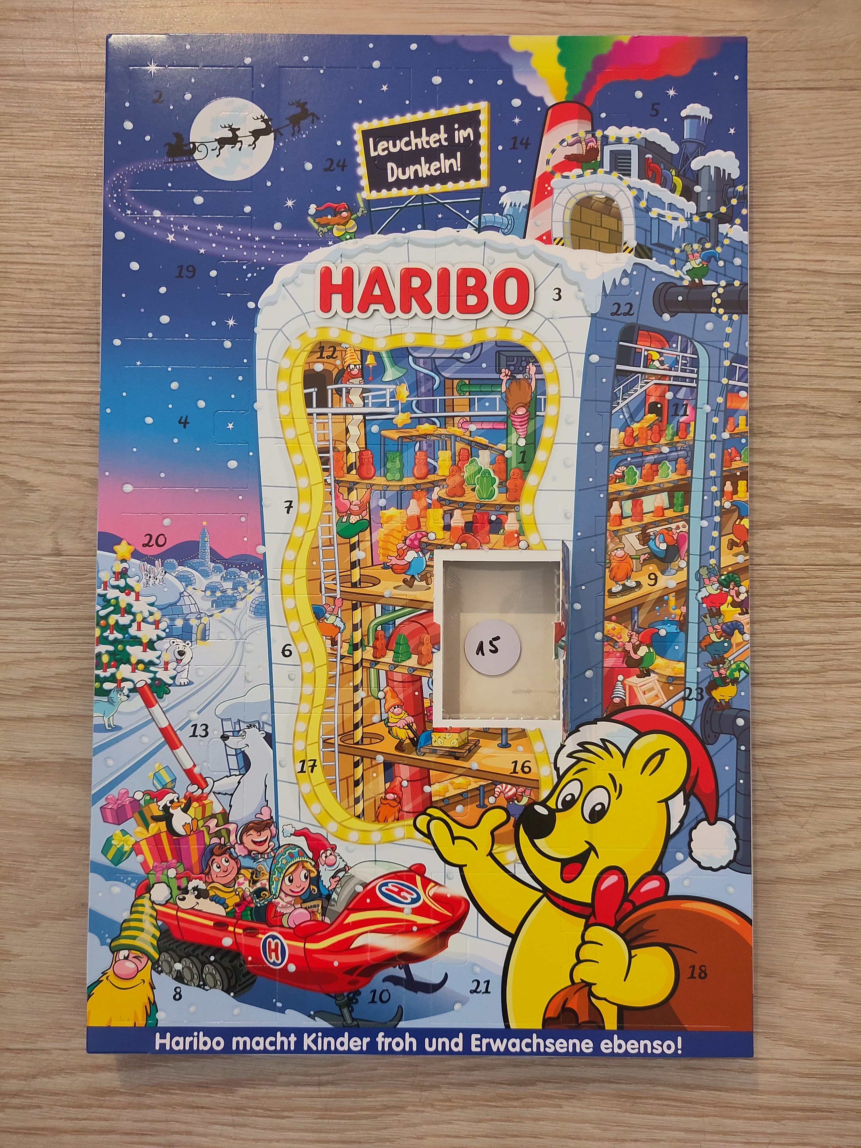 We put the chips into a regular Advent calendar — in our case, a Haribo one. I took the gummy bears for myself, of course. But don’t worry, my daughter also gets a regular analog calendar with sweets. The chips are placed into the doors, which can then be resealed.
